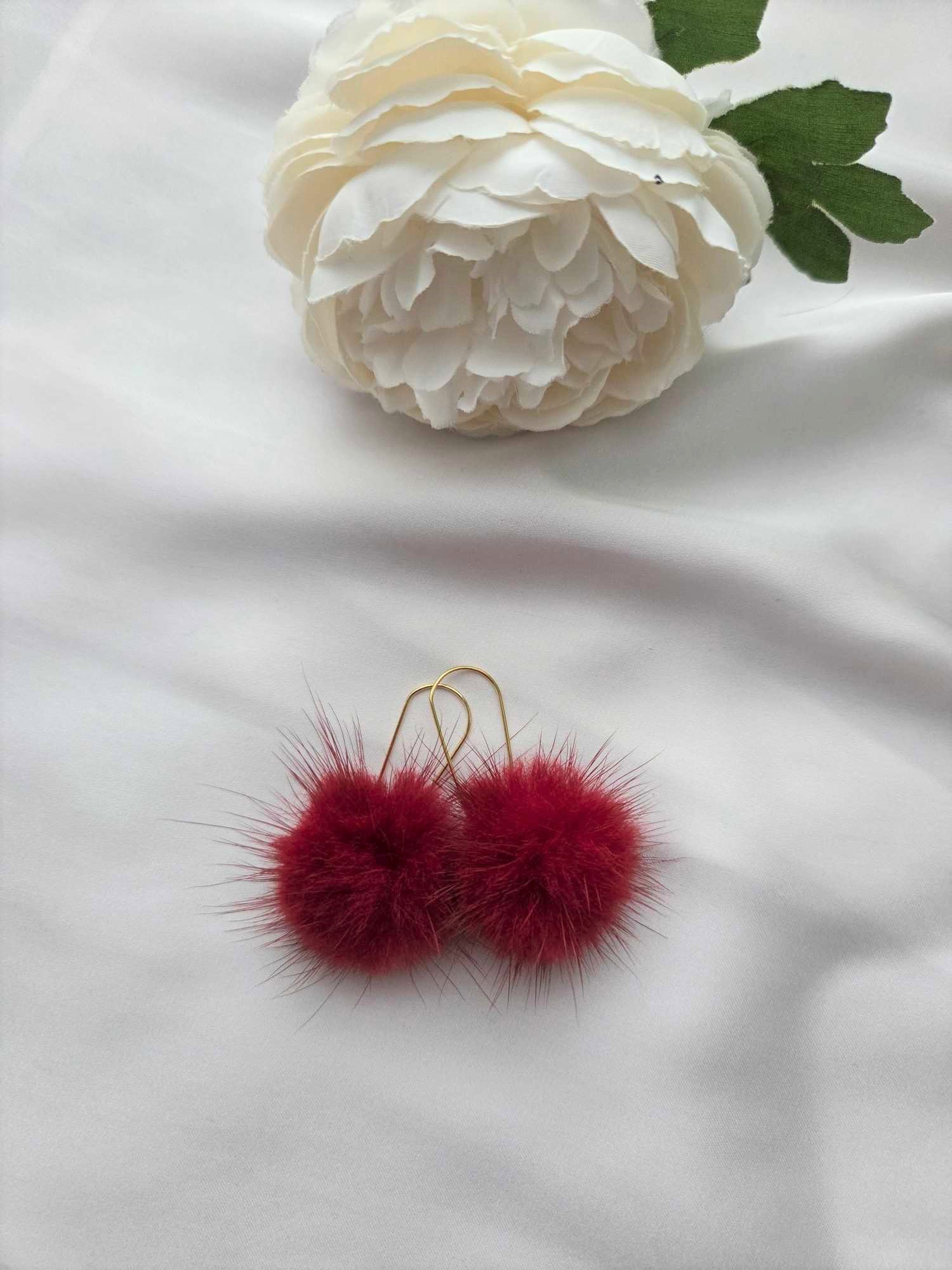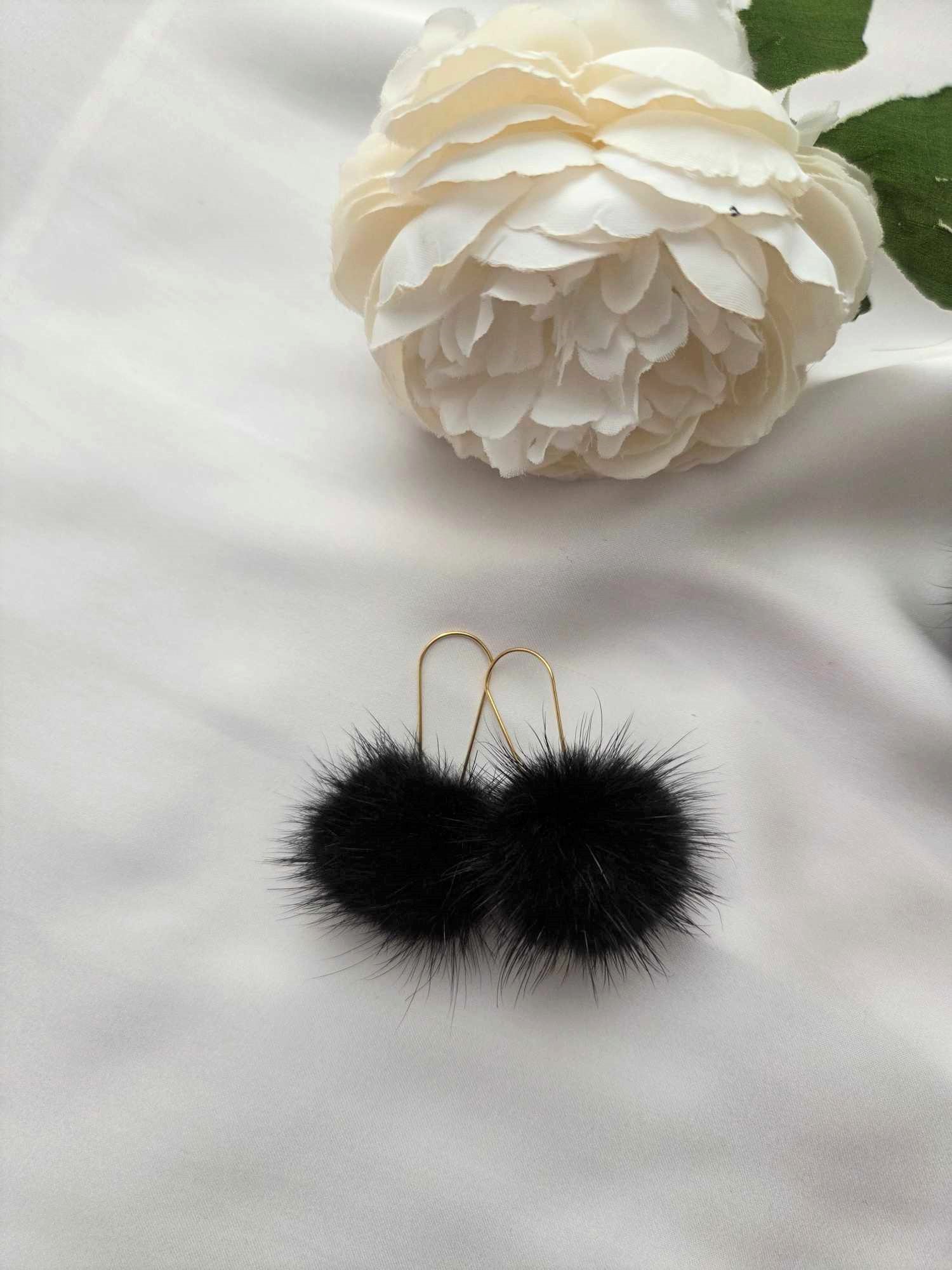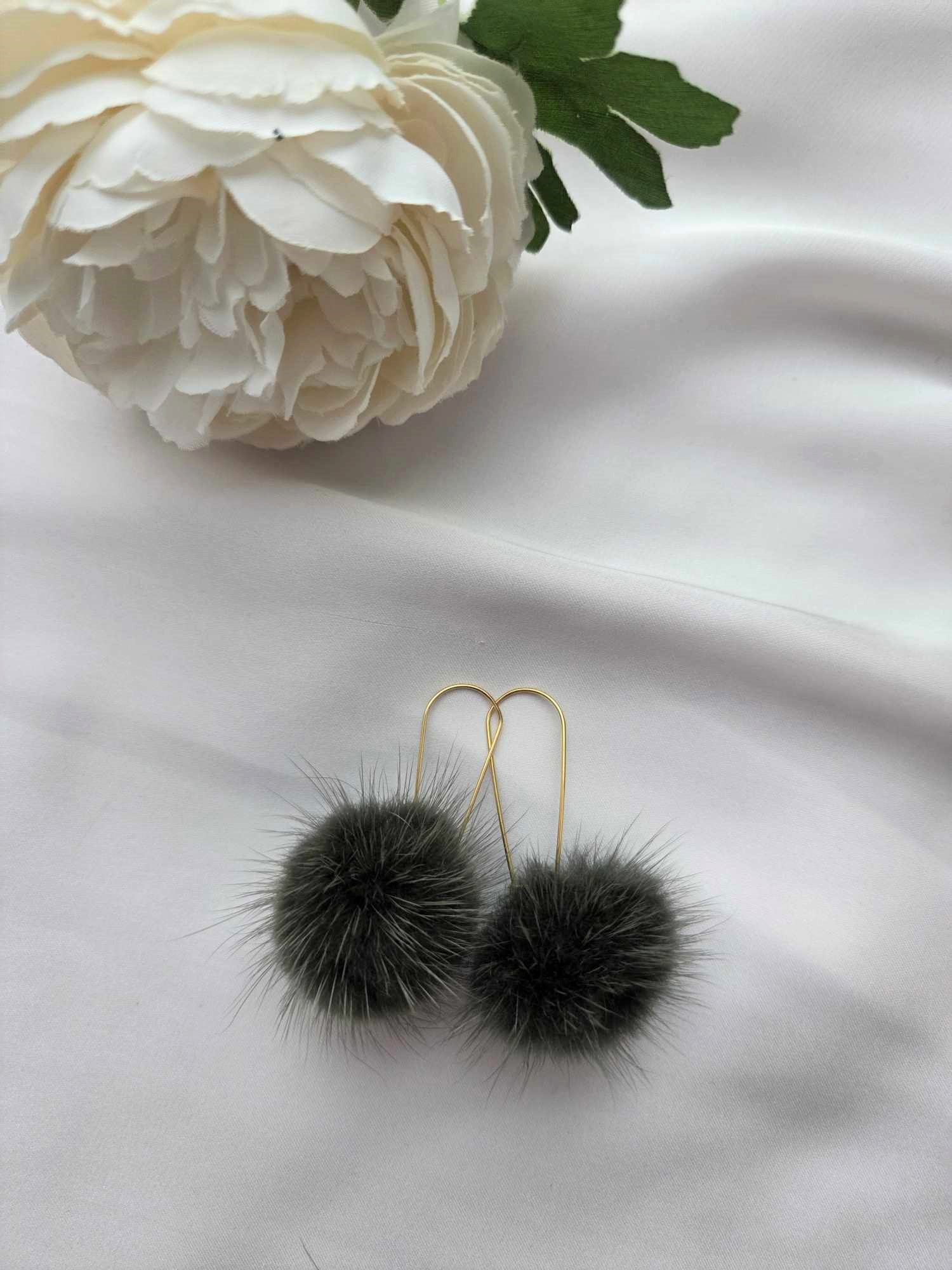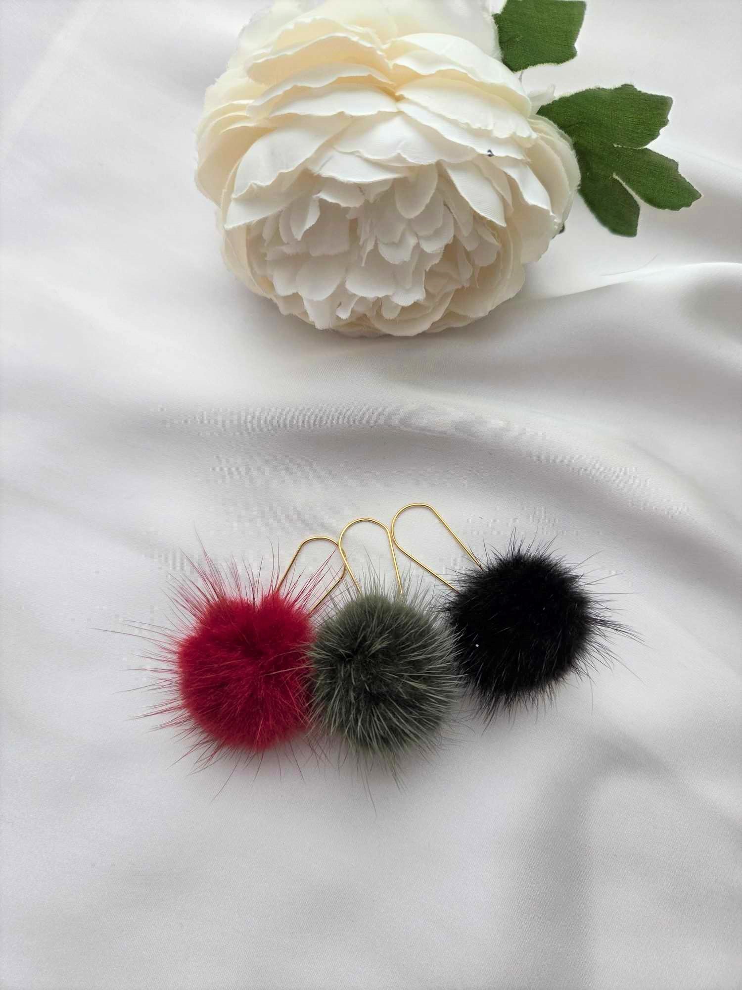 Am Anhänger befindet sich ein Nerz Puschel. Die Ohrringe sind sehr leicht und angenehm zum Tragen und in drei Farbvarianten erhältlich.