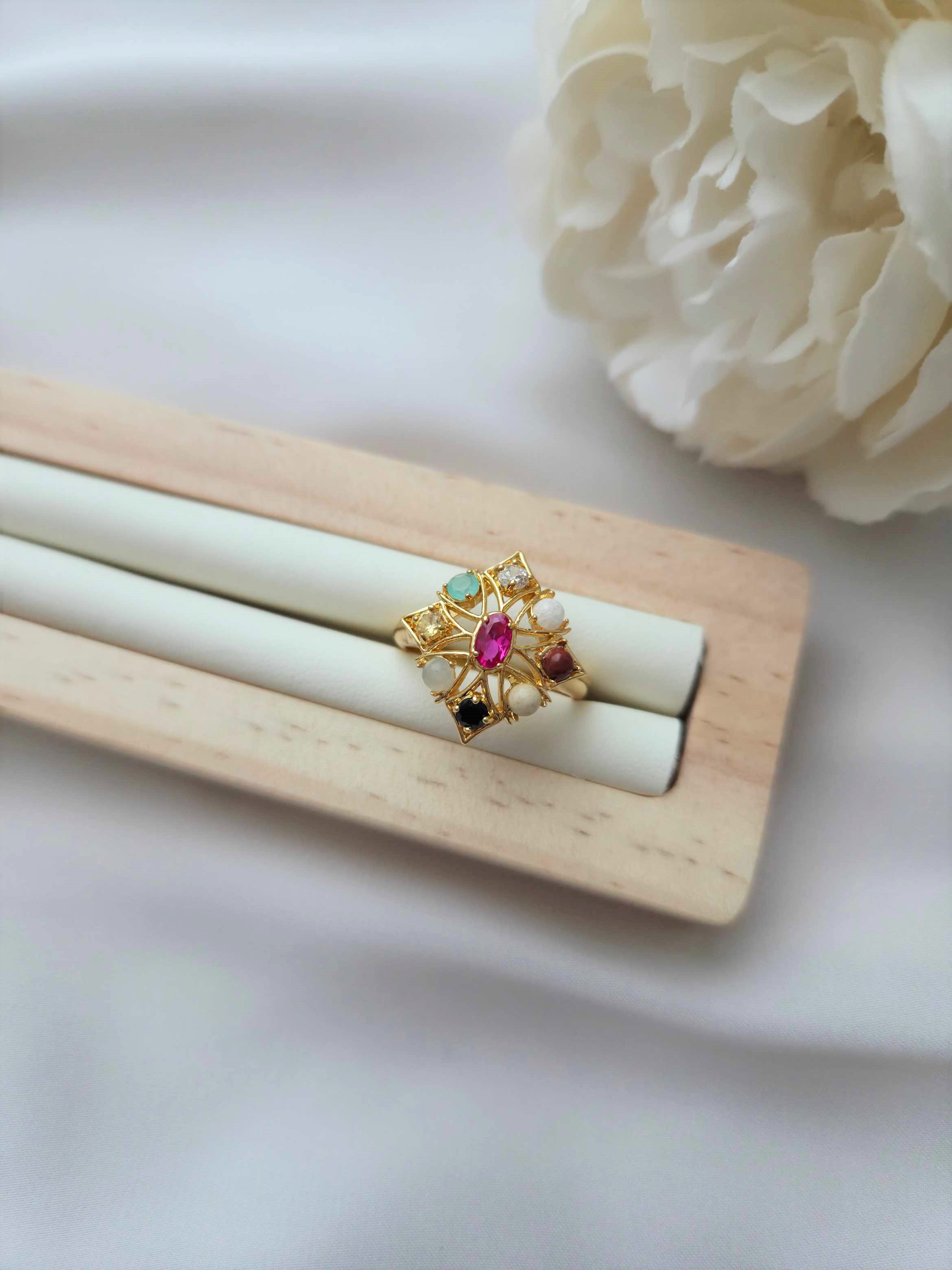 Dieser wunderschönen Ring im Vintage Stil ist mit Edelsteinen und Zirkonia Steinen besetzt. Die geschmackvolle Anordnung dieser Steine verleiht dem Ring einen einzigartigen und glamourösen Look, der perfekt für besondere Anlässe ist.
